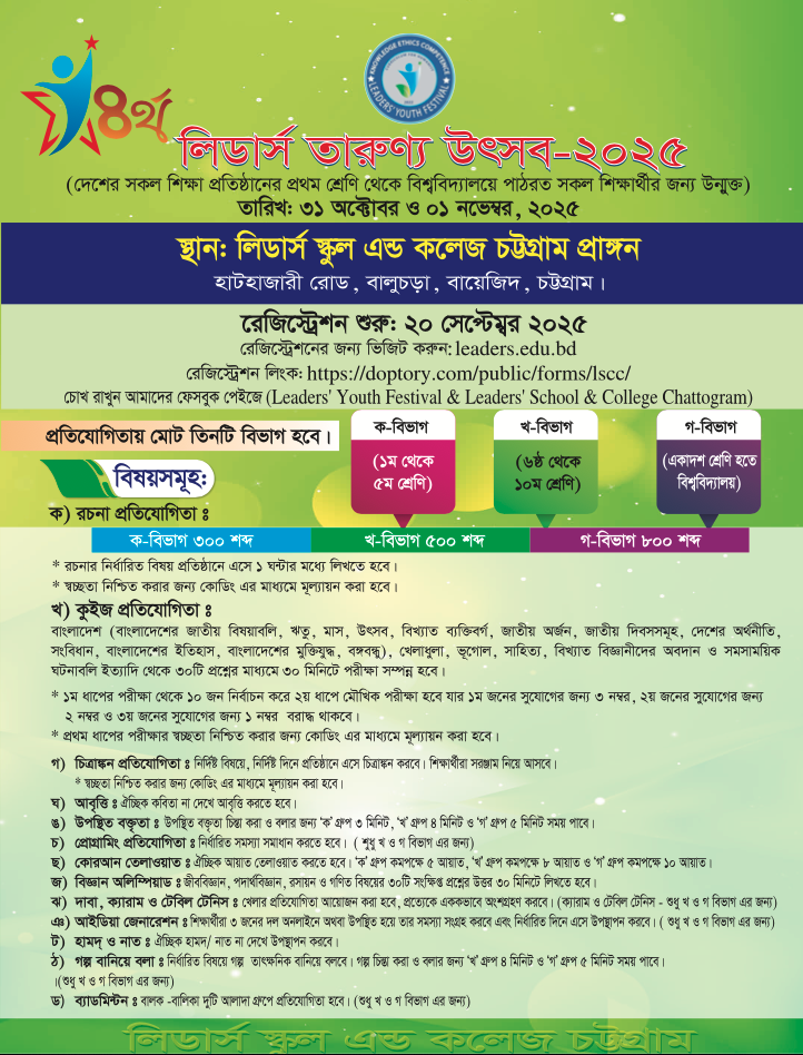 লিডার্স স্কুল এন্ড কলেজ চট্টগ্রাম আয়োজিত “Leaders’ Youth Festival 2025”-এর অন্যতম আকর্ষণীয় ইভেন্ট “আইডিয়া জেনারেশন প্রতিযোগিতা”-এ অংশগ্রহণের জন্য সকল শিক্ষার্থীদের আন্তরিকভাবে আমন্ত্রণ জানানো হচ্ছে।